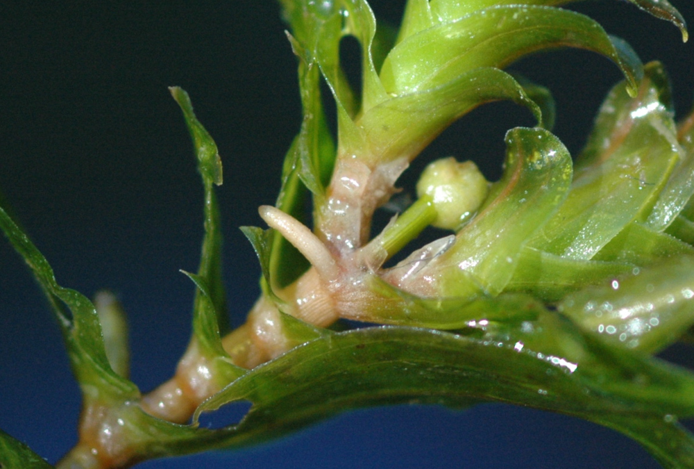 Nach der Blüte legt sich der Trieb ins Wasser und er treibt an den Verzweigungen Wurzeln aus.