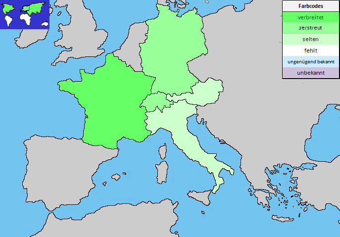 ArealEuropa (Westen, in Zentraleuropa seit dem 16. Jahrhundert eigebürgert)Nordamerika: eingebürgert in den USASchweizzerstreuthäufig verwildert (wohl oft Bastard)Details vgl. info flora (10.3.2023)Deutschlandzerstreuthäufig verwildert (wohl oft Bastard)Österreichseltenverwildert im TirolItalienzerstreutim Norden der Halbinsel (wahrscheinlich verwildert)Details vgl. Flora Italiana (10.3.2023)Frankreichverbreitetschwergewichtig im Westen des LandesDetails vgl. Tela Botanica (10.3.2023)