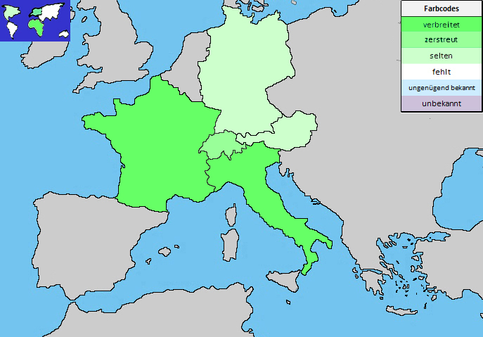 ArealEuropaAfrika (Nordwesten)AsienNordamerika (eingebürgert)Das ursprüngliche Areal ist unbekannt, in Südeuropa und Nordafrika möglicherweise ursprünglich. Nördlich der Alpen handelt es sich höchstwahrscheilich ausschliesslich um Kulturflüchtlinge.Schweizzerstreutseltenim Rückgang begriffenDetails vgl. info flora (6.1.2023)Deutschlandseltenselten, u.a. in Bayern und Baden-WürttembergÖsterreichseltensehr selten in Wien, Niederösterreich, Steiermark, Tirolin Oberösterreich ausgestorbenItalienverbreitetin der Mehrheit der RegionenFrankreichzerstreutzerstreut im ganzen Landausser in den Alpen stark zurückgehendDetails vgl. Tela Botanica (6.1.2023)
