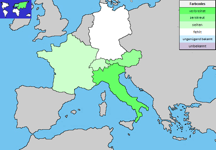 ArealEuropaAsienSchweizseltensehr seltennur im südlichen Tessen (Monte San Giorgio, Monte Generoso)Details vgl. info flora (14.11.2022)Deutschland-Österreichzerstreutim Burgenland, Wien, Niederösterreich und Steiermarkzerstreut bis seltenItalienverbreitetDetails vgl. Flora Italiana (14.11.2022)Frankreichseltensehr selten in den Alpes Maritimes, VogesenDetails vgl. Tela Botanica (14.11.2022)