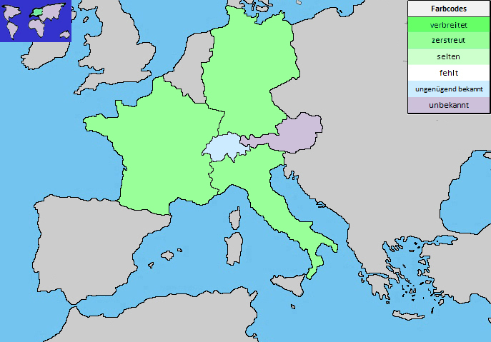 ArealEuropa ?Deutschlandzerstreutzerstreut bis seltenÖsterreich?Schweizungenügend bekanntu.a. im Juravgl. info flora, konsultiert am 10.10.2021Italienzerstreutnur in den Alpen:LombardiaTrentino Alto AdigeVeneto, Friuli Venezio Giuliavgl. Flora Italiana, konsultiert am 10.10.2021Frankreichzerstreut zerstreut, u.a. Jura, Südfrankreichvgl. Tela Botanica, konsultiert am 10.10.2021 |