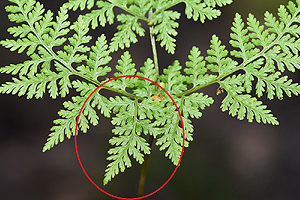 Die untere Fiederhälfte ist deutlich grösser als die obere.