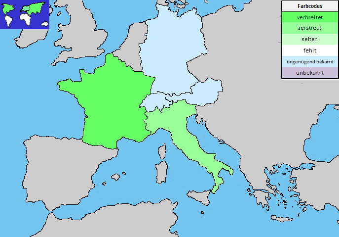 ArealEuropaAsien (Sibirien)NordamerikaSchweizzerstreut bis verbreitet (unzureichend bekannt)Deutschlandzerstreut (unzureichend bekannt)Österreichsehr selten (unzureichend bekannt)Italienzerstreutvgl. Flora Italiana, konsultiert am 30.10.2021Frankreichverbreitetin fast allen Landesteilenvgl. Tela Botanica, konsultiert am 30.10.2021