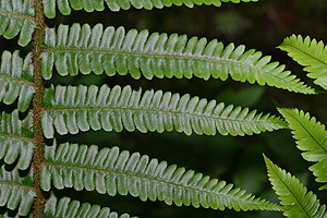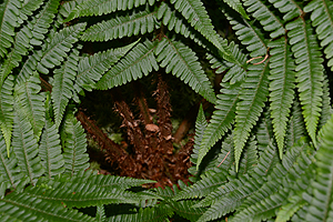 - Die Fiederspindel der mittleren Fiedern von ausgewachsenen Wedeln trägt am Grund einen dunklen Fleck. (oft unter Spreuschuppen verborgen, nur an frischen Blättern!)