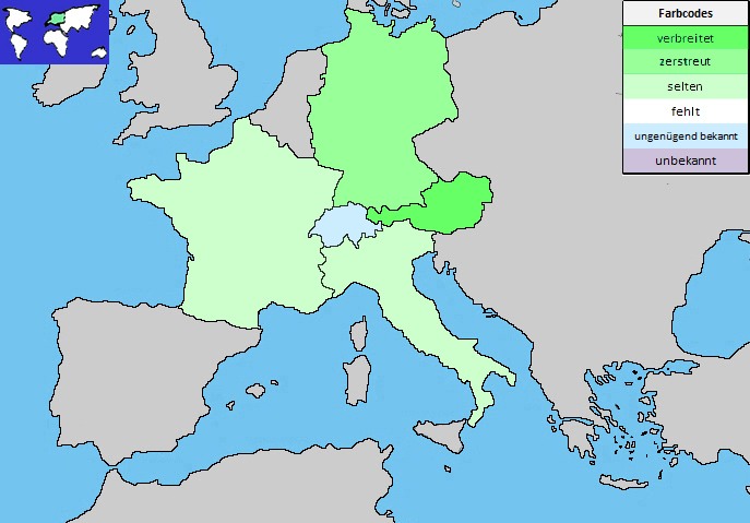 ArealEuropaSchweizungenügend bekanntDeutschlandzerstreutu.a. Alpenvorland, Schwarzwald, Bayerischer Wald, Erzgebirge?Österreichverbreitetin allen Bundesländern ?ItalienseltenLombardiaDetails vgl. Flora Italiana, konsultiert am 26.7.2021Frankreichseltenvor allem im OstenDetails vgl. Tela Botanica, konsultiert am 26.7.2021